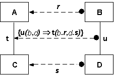 Рис. 2.34. Пример гомоморфизма Общий случай гомоморфизма показан на рисунке 2.35. Гомоморфизм отображает связи, определяемые зависимостью u, в связи, определяемые зависимостью t, являясь отображением типа "много-в-один". Гоморфизмы обычно используются при изучении связей между метаобъектами и порождаемыми ими объектами (описание детали в каталоге может рассматриваться как метадеталь).