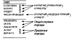 Рис 2.3. Открытые и закрытые атрибуты и операции Запросы без аргументов (за исключением неявного аргумента - объекта, к которому применяется операция) могут рассматриваться как производные атрибуты. Значения производных атрибутов зависят от значений основных атрибутов. В этом их отличие от основных атрибутов, значения которых независимы. Следовательно, значения основных атрибутов объекта определяют как его состояние, так и значения его производных атрибутов. Так, например, длина, ширина и высота комнаты - ее основные атрибуты, а площадь и кубатура - производные атрибуты; такой атрибут как кубатура нужен для того, чтобы не вычислять кубатуру комнаты всякий раз, когда понадобится ее значение. Выбор основных атрибутов объектов произволен, но в число основных атрибутов не следует включать такие атрибуты, значения которых определяются значениями других атрибутов, так что на самом деле они являются производными. Таким образом, для задания класса необходимо указать имя этого класса, а затем перечислить его атрибуты и операции (или методы). Полное описание объекта на графическом языке OMT имеет вид, изображенный на рисунке 2.4. Однако иногда удобно бывает пользоваться сокращенным описанием класса, когда в прямоугольнике, изображающем этот класс, указывается только имя класса. Так, на рисунке 2.5 приведены сокращения обозначения классов для нашего основного примера - системы обслуживания клиентов банковского консорциума.
