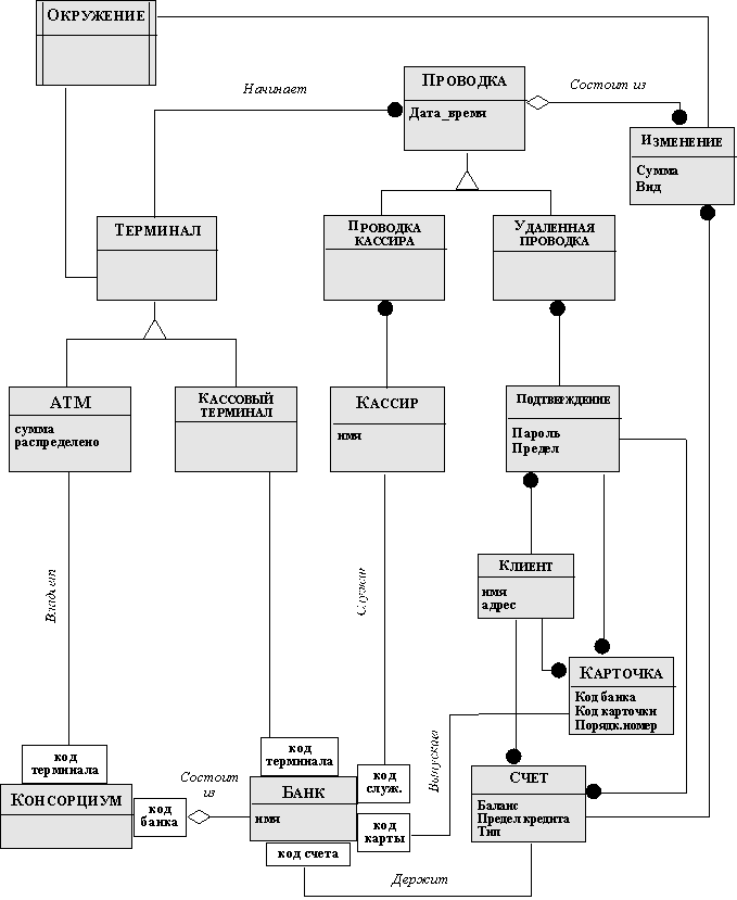 Рис. 2.42. Объектная диаграмма банковской сети и ее системного окружения Введение понятия подсистемы и возможность включать в объектную модель наряду с объектами (классами) и подсистемы определяет иерархическую структуру объектной модели и позволяет использовать методологию OMT при проектировании достаточно сложных программных систем, содержащих большое число различных объектов и классов. Назад | Содержание | Вперед |