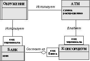 Рис. 2.43. Объектная диаграмма банковской сети после выделения подсистемы банк При этом внешние интерфейсы подсистем банк и окружение вместе с интерфейсами объектов ATM и консорциум образуют внутреннее окружение системы банковского обслуживания. Ее внешнее окружение представлено на рисунке 2.42; оно состоит из внешних интерфейсов различных программных систем, используемых в системе банковского обслуживания (на рисунке показана лишь часть этих систем), и ее собственного внешнего интерфейса. Назад | Содержание | Вперед |