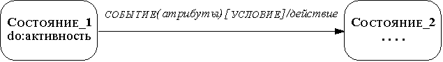 Рис. 2.48. Указание активностей и действий на диаграмме состояний Действием называется мгновенная операция, связанная с событием: при возникновении события происходит не только переход объекта в новое состояние, но и выполняется действие, связанное с этим событием. Например, в телефонной сети событие повесил трубку сопровождается действием разъединить связь (см. рисунок 2.49). Действие указывается на диаграмме состояний вслед за событием, которому оно соответствует, и его имя (или описание) отделяется от имени события косой чертой ("/") (см. рисунок 2.48).