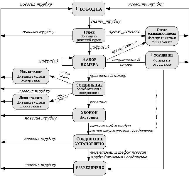 Рис. 2.49. Диаграмма состояний телефонной линии, на которой указаны активности и действия Действия могут также представлять внутренние операции управления объекта, как например, присваивание значений атрибутам или генерация других событий. Назад | Содержание | Вперед |