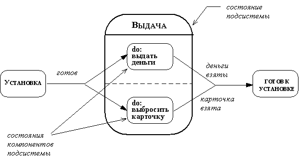 Рис. 2.51. Передача события из одного объекта другому Если объект получает события из нескольких независимых объектов, то состояние, в которое он перейдет, может зависеть от порядка, в котором будут получены эти события (а этот порядок случаен, так как объекты независимы). Это называется условием конкуренции. Одной из задач проектирования является исключение нежелательных условий конкуренции. Это достигается с помощью синхронизации. Синхронизация используется и в случае, когда в каком-либо состоянии требуется параллельно выполнить несколько активностей. В качестве примера рассмотрим устройство вывода ATM (рисунок 2.52). Оно одновременно (параллельно) выдает наличные деньги и карточку; обе эти операции можно рассматривать как составную активность, состоящую из двух параллельно работающих активностей (пунктирная линия на диаграмме состояний делит состояние на две области, в каждой из которых выполняется одна из указанных активностей). Разделение управления на два параллельных потока схематически показано в виде стрелки, которая разделяется на две: событие готов вызывает переход из состояния установка сразу в два параллельных подсостояния состояния выдача; переход в следующее состояние происходит по двум событиям деньги взяты и карточка взята; если какое-либо из этих событий произойдет раньше другого, перехода все равно не будет, пока не произойдет и второе событие (в этом и состоит синхронизация).