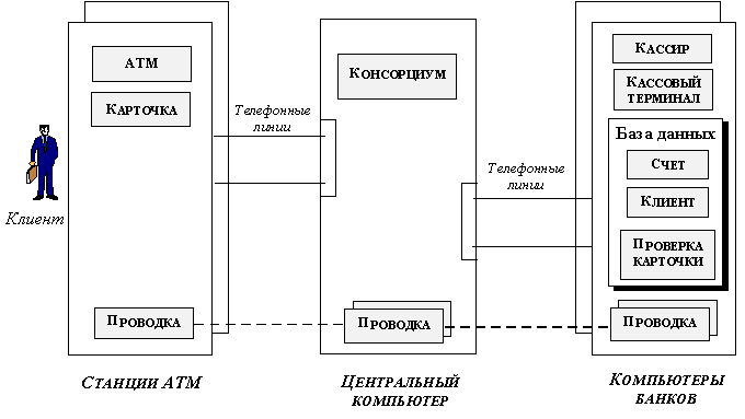 3.2. Архитектура системы управления банковской сетьюСистема управления банковской сетью, рассматриваемая нами в качестве примера, является гибридной системой: это, во-первых, система с интерактивным интерфейсом (интерактивные воздействия осуществляются с помощью кассовых терминалов и ATM), а, во-вторых, это система управления транзакциями, так как она обеспечивает выполнение проводок, которые и есть транзакции. Архитектура системы управления банковской сетью показана на рисунке 3.7. Система имеет три основных подсистемы: подсистему обслуживания ATM, подсистему консорциум и подсистему банк. Система имеет топологию звезды, в центре которой - подсистема консорциум, а на лучах - подсистемы ATM и банк (ясно, что в состав системы входит одна подсистема консорциум и по несколько подсистем ATM и банк).