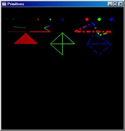3.5 Четырехугольники и многоугольникиЧетырехугольники рисуются вызовом функции glBegin с параметром GL_QUADS или GL_QUAD_STRIP. Для первого случая каждые четыре вершины определяют свой четырехугольник. Во втором случае рисуются связанные четырехугольники. Первая, вторая, третья и четвертая вершина определяют первый четырехугольник. Третья, четвертая, пятая и шестая вершина - второй четырехугольник и т.д. (2n-1), 2n, (2n+1) и (2n+2) вершины задают n-ый четырехугольник. Многоугольники задаются вызовом glBegin с параметром GL_POLYGON. Все вершины определяют один многоугольник. Для многоугольников можно задавать стили при помощи выше описанной функции glPolygonMode, толщину линии, толщину точек и цвет. 3.6 Упражнение: "Примитивы"Изобразите точки, линии, треугольники, многоугольники в одном окне, как показано ниже.