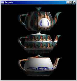 Исходный файл смотрите здесь. Исполняемый файл здесь. Конечно, фотография накладывается не самым лучшим образом. А что вы хотели? Машина сама сгенерировать правильно координаты на кривой поверхности не может. Тем не менее, если в качестве текстуры взять изображение в горошек, то оно довольно неплохо ляжет на чайник. Я не великий художник и горошек в PaintBrush'e мне изобразить не удалось. Нет, не подумайте, что я совсем криворукий, просто, горошины у меня никак не хотели строиться в одну линию, поэтому я нарисовал следующую картину - "Клеточки". И наложил эту текстуру на чайник.