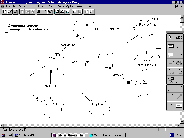 Rational Rose обеспечивает единство модели, автоматически поддерживая согласованность, разрабатываемых диаграмм. Изменения, внесенные в одну из диаграмм, гарантировано отражаются в остальных. Диаграммы классовОтображают логику построения прикладной системы. На них отображают классы, категории классов и отношения между ними. Возможность отражения параметризованых классов. Допускаются разнообразные отношения: ассоциации, включения, использования, наследования. Имеются простые и удобные средства просмотра иерархий диаграмм классов.