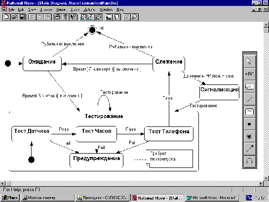 Диаграммы сценариев сообщений могут сопровождаться структурированным текстом. Диаграмма состоянийДля каждого класса может быть создана диаграмма состояний. На ней указывается начальное, конечное и промежуточные состояния, а также события, определяющие переход из одного состояния в другое. Имеется возможность гнездования состояний. Диаграмма процессовИзображаются процессоры и устройства, образующие физическую конфигурацию прикладной системы Диаграммы модулейДиаграммы модулей - физическая модель системы. Показывает подсистемы проектируемого приложения и основные модули каждой из них. Диаграммы модулей образуют иерархию. Для каждого модуля можно отдельно показать на диаграмме его файл-заголовок и файл реализации. Модули