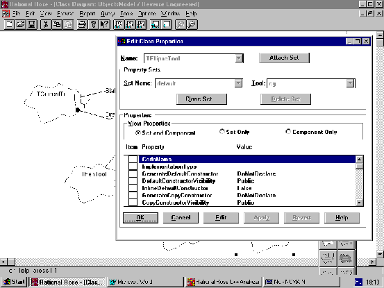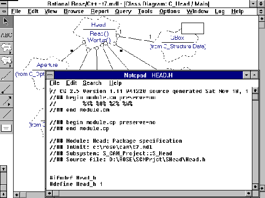 Автоматическая генерация С++ кода.Rational Rose/C++ включает средства автоматической генерации кодов программ на языке С++. Используя информацию, содержащуюся в модели проекта, генератор кодов формирует файлы заголовков и файлы реализаций классов. Создаваемая структура программы может быть уточнена путем прямого программирования на языке С++. При повторной генерации внесенные изменения не теряются Стиль структуры программы в коде С++ формируется настройкой свойств (properties) проекта. Ошибки, обнаруженные генератором кодов С++, представляются в специальном Log файле. Свойства генерации кода могут быть настроены как для всего проекта, так и для отдельных его компонент.