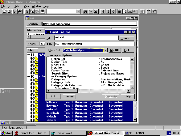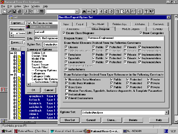 Реинжениринг моделиRational Rose/C++ включает анализатор C++ (Analyzer), поставляемый как отдельно исполняемый модуль, который грузится независимо от Rose/C++. Реинжениринг модели это процесс исследования программного кода для извлечения информации о его структуре. Analyzer извлекает информацию из С++ кодов и использует ее для построения модели программного кода. После работы анализатора модель может быть перенесена в систему в виде диаграмм классов и модулей и проанализирована средствами Rational Rose/C++. Анализируется только структура кода. Исходный код может содержать ошибки реализации