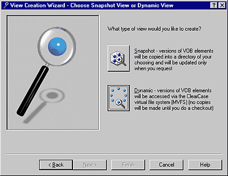 Рис. 2. Создание вида. На этапе создания вида разработчик выбирает его тип и место хранения локальных служебных данных. Система видов разительно отличает ClearCase от продуктов конкурирующих фирм, поскольку позволяет осуществить прозрачную работу и контроль над проектом. Что же такое вид? С точки зрения любого участника вид - это сетевой диск, на котором хранятся необходимые файлы. При этом полученные сетевые диски содержат последние версии проектных файлов, что, впрочем, не мешает перенастроить ClearCase таким образом, чтобы вид был сориентирован на отличную от текущей версию файла. Подобный подход делает систему разработки и поддержания нескольких версий не просто быстрой, а молниеносной (рис. 3).