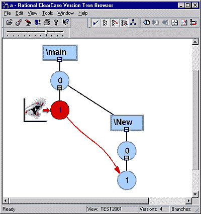 Рис. 4. Окно дерева версий для одного файлового элемента. Каждый кружок представляет собой версию редакции, а красные стрелки указывают на объединение версий. ClearCase обеспечивает тесную интеграцию с продуктами самой Rational (Rose, SoDA, ClearQuest, Requisite PRO), со средствами разработки и офисными приложениями компании Microsoft (Visual C++, Visual Basic, MS Word), а также с продуктами других компаний (более подробные сведения о вопросах интеграции и совместимости ClearCase со средствами разработки можно найти на сайте www.interface.ru). На чем основана программаДля реализации полного контроля над версиями в специальную базу данных - VOB (Version Object Base) - заносятся все изменения данных проекта. Репозитарии, хранящие всю промежуточную информацию о состоянии проекта, могут находиться в локальной сети как на одном компьютере, так и раздельно. Физически VOB представляет собой некую файловую структуру, закодированную особым образом. Основой VOB являются элементы, представляющие собой файлы или каталоги. Элемент должен и может иметь одну или несколько версий. Все элементы VOB имеют свою уникальную версию. При создании VOB получает определенный набор характеристик, на основании которых в дальнейшем можно определить (при наличии соответствующих полномочий) историю его создания. Над VOB можно осуществлять операции монтирования/демонтирования, создания/удаления. Для работы с конкретным репозитарием каждый участник монтирует его на своем компьютере. Создания одной только базы данных для полноценной работы в ClearCase недостаточно, необходим также клиент для доступа к ней. Для всех манипуляций над базой данных, в соответствии с правами пользователей, применяется механизм настраиваемых видов (VIEW), являющийся технологическим средством фильтрации находящейся в VOB информации и преобразующий все подмножество элементов со своими версиями в вид, понятный не только машине, но и человеку. Такой подход позволяет разработчику или техническому писателю видеть не все файлы, составляющие проект, а только необходимые для решения конкретной задачи. Таким образом, ClearCase позволяет достаточно легко абстрагироваться от текущего состояния и сосредоточиться на определенной части проекта. Исключительно через систему видов возможны все операции, присущие не только ClearCase, но и любому другому средству версионного и конфигурационного контроля, такие как установка контроля файла (Add To Source Control), при котором для каждого элемента создается дерево версий, операции Check-in и Check-Out, позволяющие редактировать отдельный файл, создавая дерево версий, на котором отражена полная история развития отдельного элемента (рис. 5).