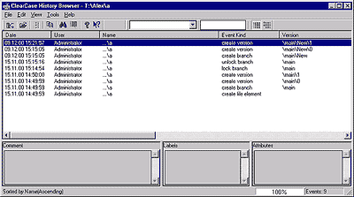 Рис. 5. История редактирования файла. Помимо этого ClearCase обеспечивает менеджеров проекта и разработчиков специальным модулем отчетности, с помощью которого можно получать справочную информацию об истории редактирования того или иного элемента в отдельности или группы элементов. Отчет может быть экспортирован в Microsoft Word (посредством инструмента SoDA), выведен на экран или опубликован в Интернете. Виды в программе представлены двумя типами - Dynamic и Snapshot, имеющими свои достоинства и недостатки, но при совместном использовании способными открыть новые возможности в контроле над файлами. Специфика вида Dynamic заключается в том, что данный вид (Windows NT, UNIX) создает виртуальную файловую систему, на которой размещаются все подконтрольные данные. Сама файловая система размещается также на виртуальном диске, физически размещенном на сервере. Для конечного пользователя в этом случае работа с таким видом сведется к работе с новым сетевым диском. Данный способ позволяет осуществлять контроль над файлами в реальном масштабе времени. Основные преимущества данного способа представлены перенастраиваемыми видами. Эффективность использования особенно ярко проявляется Dynamic View в случаях, когда менеджерам необходимо одновременно контролировать несколько проектов, либо для настройки конфигураций, когда необходимо поддерживать одинаковые версии исходных файлов для разных операционных систем. Вид типа Snapshot оправдывает свое название, создавая "снимок" текущего состояния проекта на локальной машине. Разработчик получает на своем диске точную копию либо всего проекта, либо необходимой его части - файла, группы файлов: Важным моментом при такой работе является синхронизация локальных данных с общим проектом, которая в данном случае выполняется не автоматически, а по команде пользователя. Это делает возможной удаленную работу над проектом, позволяя любому разработчику взять материал "на дом", после чего вернуть новые версии файлов в проект. Имея мощный набор инструментов, настраивающих вид, можно добиться поразительных эффектов, недоступных для других программ версионного контроля. Неоценимой является возможность параллельной разработки, когда программа допускает правку одного и того же файла несколькими разработчиками, создавая ответвление на дереве версий (одно или несколько - в зависимости от числа разработчиков, использующих данный файл). Как уже говорилось ранее, для каждого файла создается дерево версий. Дерево состоит из корня и версионных ответвлений. Здесь следует отметить две разновидности ответвлений: простое ответвление (Branch), создаваемое для отдельного файла и в любых количествах, и главное ответвление (Private Branch) - для всего проекта, когда создается новая ветвь (может быть только одна) для всех файлов, составляющих проект. Для объединения версий в ClearCase предусмотрена специальная утилита - MergeManager - менеджер слияний, который под контролем менеджера проекта собирает из двух предоставленных файлов один. Сборка осуществляется либо автоматически (тривиальная сборка), когда различия между файлами невелики, либо по выбранной менеджером проекта строке кода для слияния (нетривиальная сборка). По окончании слияния создается новая версия, которую далее также можно править, объединять с другими версиями, делать ответвления. Слияние фай