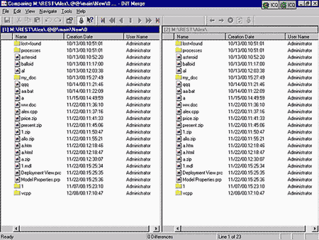 Рис 17. Так можно сравнить, а затем и объединить два каталога. Обратите внимание на красную стрелку и синие полосы - это отсутствующий файл, требующий объединения. Здесь необходимо помнить, что каталог также является элементом и ему присваивается новый номер версии каждый раз, когда в состав проекта вносится новый файл или подкаталог.