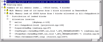 Вновь обратимся к рисунку со статистикой, где в явном виде находится информация по ошибкам и по модулям, в которых эти ошибки были обнаружены. К приятной неожиданности можно отнести фразу "Memory leak of 60000", указывающую на то, сколько фактических байтов памяти программа не вернула системе, по завершении своей работы. Эта черта разительно отличает подходы к тестированию программы Rational Purify от подобных продуктов конкурирующих компаний, которые высчитывают не фактические утечки (полученные в результате нескольких вызовов при реальной работе приложения, а количество невозвращенных блоков, то есть ограничиваются лишь анализом (на уровне исходных текстов) программы с выявлением вызовов функций аллокирования памяти без последующего освобождения. Из этого и следует полученное число 60000 - фактически не освобожденных блоков (3 по 20000). После добавления функции free(alex) в конец обработчика OnAppAbout и перекомпиляции тестируемого приложения, Purify не обнаруживает никаких ошибок памяти, что и являлось нашей целью.