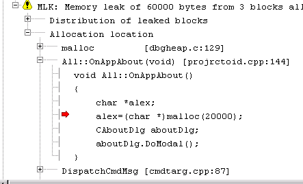 Добавление интеллекта к функции OnAppAbout сделано намерено, поскольку во время работы можно воспользоваться данной функцией несколько раз подряд, активируя диалог "ABOUT" после игр с его вызовом. Теперь завершим приложение, посмотрим статистику по памяти и под конец найдем "виновного" в полученной утечке памяти. Из фрагмента видно, что указатель "alex" смотрит в сторону блока длиной в 20Кб, который выделяется функцией MALLOC. Еще можно заметить, что: 1) указатель нигде не используется, 2) Блок памяти не освобождается.