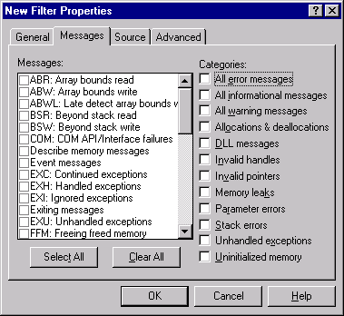 Как видно из рисунка, предполагается ставить фильтры либо по сообщениям (вручную) либо по категориям (при этом соответствующие сообщения выберутся автоматически). Обратите внимание на список сообщений: количество доходит до 41 и растет с каждой новой версией! Перед тем, как мы перейдем к рассмотрению всех сообщений, хочется отметить очень важный нюанс: Purify способен работать совместно с отладчиком (он прописывается отдельно). В этом случае возможна двойная работа по отладке программы с установкой брейкпоинтов:. итд.