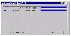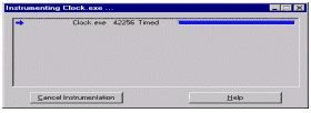 Рисунок 2 Попробуем рассмотреть работу Quantify на конкретном примере - например, используя стандартную программу "Clock" из состава Windows NT 4.0 выяснить, сколько и чего она вызывает. После загрузки необходимо под контролем Quantify исполнить "Clock", как в обыкновенном отладчике, с той лишь разницей, что здесь нельзя наблюдать дизассемблированный код программы. На рисунке 1 показан диалог запуска "подопытного" приложения. Как видно, в данном диалоге нет никакой сложности. Quantify для работы необходимо знать только месторасположение программы и рабочий каталог. Рисунок 2 выводит на экран сведения о собираемой статистике. В зависимости от количества подключаемых библиотек, количество строк также изменяется. Подобная информация собирается для всех подключаемых модулей.