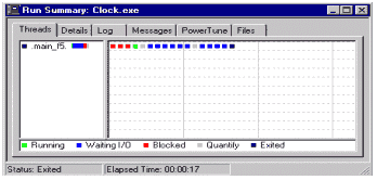 Рисунок 4 После такой преамбулы запускается само тестируемое приложение, без каких бы то ни было видимых ограничений: все идет как обычно. Однако, работа Quantify на этом не заканчивается: программа продолжает контролировать тестируемое приложение, отслеживая и подсчитывая число обращений ко всем функциям, вызываемых "подопытной" программой. В любой момент времени можно получить слепок состояния (snapshot), показывающий общий список вызовов на данный момент работы, который впоследствии можно проанализировать. Вся статистика во время работы приложения отображается в специальном окне (рис. 4), где в наглядной форме демонстрируется временная диаграмма исполнения приложения. Здесь отображается временная характеристика (сколько приложение работало), демонстрируется (разноцветными квадратами), чем оно было занято в определенный момент времени и, самое важное, как завершилось. В закладках можно найти более детализованное описание как тестируемой программы, так и компьютера в целом. Еще один любопытный момент: во время сбора разработчик может работать со своим продуктом как обычно: нажимать на кнопки, заходить в меню и пр. Естественно, при этом вызываются явным образом определенные функции в тестируемой программе, которые тут же попадают в статистику Quantify.