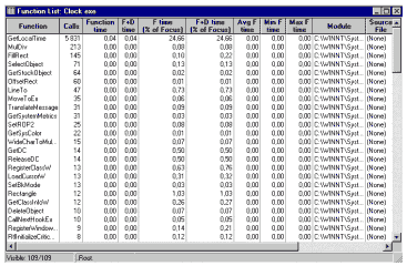 Рисунок 6 Начнем описание по порядку. На рисунке 5 показано дерево вызовов для приложения "Clock". Двойное нажатие на любой функции вызовет либо поддерево (если функция разворачиваемая), либо статистическую выкладку по числу вызовов данной функции. Следующий рисунок (№ 6) демонстрирует окно списка, где отображаются в табличном виде наименования всех функций со всеми характеристиками. Здесь можно, отсортировав список по определенному признаку, выяснить какие функции сколько раз вызывались и сколько времени заняли. Табличное представление позволяет сравнивать временные интервалы и вызовы нескольких функций (вызовов) для более глубокого сравнительного анализа. Возвращаясь к рисунку 6, хочется обратить ваше внимание на то, какую детальную информацию представляет Quantify. Приглядевшись, можно заметить, что самая часто вызываемая функция это - "GetLocalTime", число вызовов составляет 5831. Соответственно, получив такую информацию, разработчик сам решит, стоит или нет заниматься ее оптимизацией.