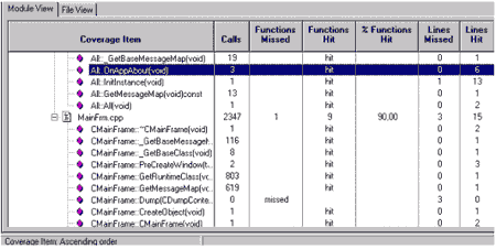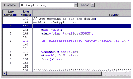 Рисунок 13 После такого провала уже никому не доказать, сколько бессонных ночей проведено в детальном всестороннем тестировании программы, и что как раз именно не прошедшая тестирование функция привела к фатальному сбою... Но если Вы, как разработчик, воспользуетесь средством Rational PureCoverage, то сможете раз и навсегда забыть о мучительном поиске невыполненного кода в собственной программе. Pure Coverage собирает статистику о тех участках программы, которые во время тестирования не были выполнены (пройдены). Подобные строки Pure Coverage подсвечивает красным цветом, четко указывая на наличие черных дыр в программе в виде неоттестированного кода, и тем самым давая разработчику хорошую пищу для размышлений. В работе данный инструмент так же прост, как и предыдущие. Вызывать его можно как из Visual Studio, так и независимым приложением, например, из командной строки. По принципу работы Pure Coverage слегка напоминает Quantify, поскольку также подсчитывает количество вызовов функций. Правда, получаемая статистика не столь исчерпывающая как в Quantify, но для целей проверки отдельных частей на предмет прохождения теста вполне пригодна. На рисунке 13 показана статистическая выкладка, собранная Coverage. Как можно видеть, программа способна предоставить отчет пользователю в двух уровнях детальности: на уровне модулей и на уровне файлов - каждый из них показывает практически одно и то же, но как бы "с разных сторон". Статистика, показанная справа от имени функции, описывает число вызовов, ее статус, а также дополнительную информацию по выполненным линиям в исходном тексте: "Lines Hits" - число строк в процедуре, "Lines Missed" - пропущено при тестировании. Анализ только данного окна статистики позволит и отыскать не оттестированные функции, и перейти к исходному тексту для детального рассмотрения. В целях демонстрации я внес некоторые изменения в диалог OnAppAbout, описанный выше, а для усиления эффекта - блок проверки значения указателя "alex". Как известно, функция malloc возвращает 0 при невозможности выделения блока памяти запрошенного размера. Соответственно, при совпадении условия (нехватка памяти!) на экран выведется диалоговое окно с устрашающим предупреждением об ошибке.
