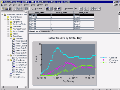 Следующее решение от Rational (простите за каламбур) - это средство управления запросами на изменение - ClearQuest. Поскольку проект постоянно меняется, руководителям, менеджерам жизненно необходимо знать статистику того, что менялось, кем и в какое время. В большинстве же случаев необходимо видеть не просто объемную информацию о том или ином событии, а хочется иметь на какой-либо базе данных, скажем, на Oracle, полный объем необходимой информации. ClearQuest помогает в решении данной задачи: ClearQuest