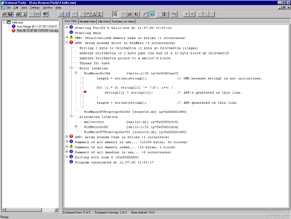 Данный продукт направлен на разрешение всех проблем, связанных с утечками памяти и Run-time ошибками. Не секрет, что многие программные продукты ведут себя "не слишком скромно", замыкая на себя во время работы все системные ресурсы без большой на то необходимости. А это и есть путь, который приведет готовую систему к краху в самый ответственный момент. Возникновение подобного рода ошибок достаточно трудно отследить стандартными средствами, имеющимися в арсенале разработчика. И дело тут не только в том, что разработчик может где-то недосмотреть, где-то пересмотреть, а в том, что в подавляющем большинстве случаев проектные сроки вынуждают смотреть "сквозь пальцы" на неточности. Стандартного, общепризнанного рецепта для решения подобных проблем не было до недавнего времени (просто не было продукта, который бы взял на себя поиск подобных ошибок, освободив разработчика для более абстрактных, концептуальных материй). Как видится, имея в своем распоряжении надежный инструмент, который бы сам в процессе работы над проектом указывал на все черные дыры в использовании памяти, разработчики начали бы его повсеместное внедрение, повысив надежность создаваемого ПО В общих чертах работа Purify сводится к выводу детальнейшей статистики об использовании памяти приложением. Программа собирает данные о любых потерях в памяти. К ним можно отнести и банальное невозвращение блока, и не использование указателей, и остановку исполнения программы с выводом состояния среды при возникновении ошибки run-time. Purify предоставляет возможность разработчику не только видеть состояние исполнения (предупреждения, ошибки), но и переходить к соответствующему исходному тексту (естественно, такая возможность существует только для внутренних вызовов, поскольку исходные тексты динамических библиотек пока программистам недоступны). Очень мощный продукт, обладает достаточно простым интерфейсом и осваивается специалистом за 2-3 дня. Продукт ориентирован на разработчиков. Назад | Содержание | Вперед