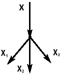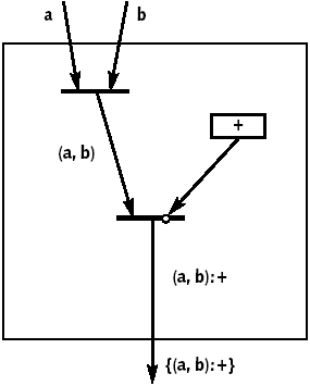 Оператор копирования осуществляет передачу данных с единственного входа на множество выходов. В текстовой форме копирование определяется через именование передаваемой величины и дальнейшее использование введенного обозначения. Используется постфиксное именование размножаемого объекта в форме: величина >> имя, и его префиксный эквивалент, имеющий вид: имя << величина. Например: y << F^x; (x, y):+ >> c. В графическом представлении (рис. 3) передача фиксируется установкой разметки на дугах, связанных с выходами вершины при размеченной входной дуге.