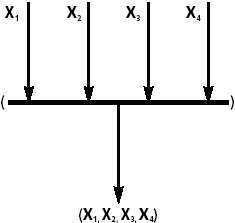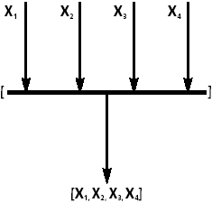 Оператор группировки в список (рис. 4) имеет несколько входов и один выход. Он обеспечивает структуризацию и упорядочение данных, поступающих по дугам из различных источников. Порядок элементов определяется номерами входов, каждому из которых соответствует натуральное число в диапазоне от 1 до N. В текстовом виде оператор задается ограничением элементов списка круглыми скобками. Нумерация элементов списка в данном случае задается неявно в соответствии с порядком их следования слева направо; это соглашение действует и в графическом представлении при отсутствии явной нумерации входов.