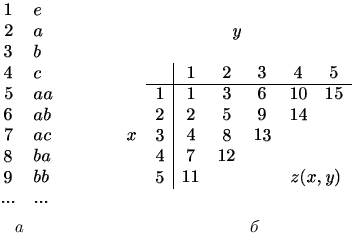 2.2 Представление языковПроцедура - это конечная последовательность инструкций, которые могут быть механически выполнены. Примером может служить машинная программа. Процедура, которая всегда заканчивается, называется алгоритмом. Один из способов представления языка - дать алгоритм, определяющий, принадлежит ли цепочка языку. Более общий способ состоит в том, чтобы дать процедуру, которая останавливается с ответом «да» для цепочек, принадлежащих языку, и либо останавливается с ответом «нет», либо вообще не останавливается для цепочек, не принадлежащих языку. Говорят, что такая процедура или алгоритм распознает язык. Такой метод представляет язык с точки зрения распознавания. Язык можно также представить методом порождения. А именно, можно дать процедуру, которая систематически порождает в определенном порядке цепочки языка. Если мы можем распознать цепочки языка над алфавитом V либо с помощью процедуры, либо с помощью алгоритма, то мы можем и генерировать язык, поскольку мы можем систематически генерировать все цепочки из V *, проверять каждую цепочку на принадлежность языку и выдавать список только цепочек языка. Но если процедура не всегда заканчивается при проверке цепочки, мы не сдвинемся дальше первой цепочки, на которой процедура не заканчивается. Эту проблему можно обойти, организовав проверку таким образом, чтобы процедура никогда не продолжала проверять одну цепочку бесконечно. Для этого введем следующую конструкцию. Предположим, что V имеет p символов. Мы можем рассматривать цепочки из V * как числа, представленные в базисе p, плюс пустая цепочка e. Можно занумеровать цепочки в порядке возрастания длины и в «числовом» порядке для цепочек одинаковой длины. Такая нумерация для цепочек языка {a, b, c}* приведена на рис. 2.1, а. Пусть P - процедура для проверки принадлежности цепочки языку L. Предположим, что P может быть представлена дискретными шагами, так что имеет смысл говорить об i-ом шаге процедуры для любой данной цепочки. Прежде чем дать процедуру перечисления цепочек языка L, дадим процедуру нумерации пар положительных чисел. Все упорядоченные пары положительных чисел (x, y) можно отобразить на множество положительных чисел следующей формулой: ![]() Пары целых положительных чисел можно упорядочить в соответствии со значением z (рис. 2.1, б).