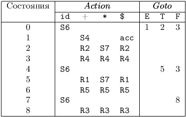 Алгоритм 4.10. Построение LR(1)-таблицы. Вход. Каноническая система C = {I0, I1, ..., In} множеств допустимых LR(1)-ситуаций для грамматики G. Выход. Функции Action и Goto, составляющие LR(1)-таблицу для грамматики G. Метод. Для каждого состояния i функции Action[i, a] и Goto[i, X] строятся по множеству ситуаций Ii: