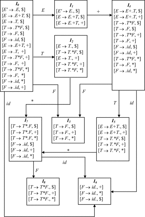 Множества ситуаций и переходы по goto для этой грамматики приведены на рис. 4.11. LR(1)-таблица для этой грамматики приведена на рис. 4.9.