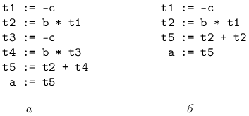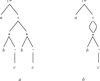 8. Промежуточное представление программыВ процессе трансляции компилятор часто используют промежуточное представление (ПП) исходной программы, предназначенное прежде всего для удобства генерации кода и/или проведения различных оптимизаций. Сама форма ПП зависит от целей его использования. Наиболее часто используемыми формами ПП является ориентированный граф (в частности, абстрактное синтаксическое дерево, в том числе атрибутированное), трехадресный код (в виде троек или четверок), префиксная и постфиксная запись. 8.1 Представление в виде ориентированного графаПростейшей формой промежуточного представления является синтаксическое дерево программы. Ту же самую информацию о входной программе, но в более компактной форме дает ориентированный ациклический граф (ОАГ), в котором в одну вершину объединены вершины синтаксического дерева, представляющие общие подвыражения. Синтаксическое дерево и ОАГ для оператора присваивания a := b *-c + b *-c приведены на рис. 8.1. На рис. 8.2 приведены два представления в памяти синтаксического дерева на рис. 8.1, а. Каждая вершина кодируется записью с полем для операции и полями для указателей на потомков. На рис. 8.2, б, вершины размещены в массиве записей и индекс (или вход) вершины служит указателем на нее.