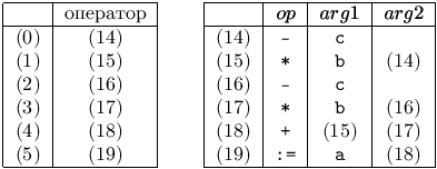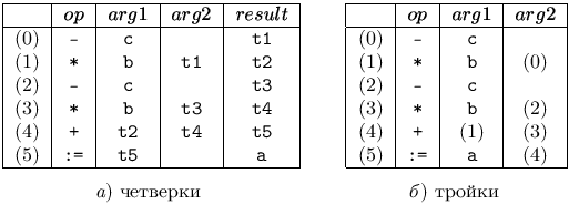 Представления синтаксического дерева и графа рис. 8.1 в виде трехадресного кода дано на рис. 8.3, а, и 8.3, б, соответственно. Трехадресный код - это абстрактная форма промежуточного кода. В реализации трехадресный код может быть представлен записями с полями для операции и операндов. Рассмотрим три способа реализации трехадресного кода: четверки, тройки и косвенные тройки. Четверка - это запись с четырьмя полями, которые будем называть op, arg1, arg2 и result. Поле op содержит код операции. В операторах с унарными операциями типа x := -y или x := y поле arg2 не используется. В некоторых операциях (типа «передать параметр») могут не использоваться ни arg2, ни result. Условные и безусловные переходы помещают в result метку перехода. На рис. 8.4, а, приведены четверки для оператора присваивания a := b *-c + b *-c. Они получены из трехадресного кода на рис. 8.3, а.