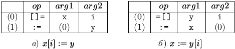 Обычно содержимое полей arg1, arg2 и result - это указатели на входы таблицы символов для имен, представляемых этими полями. Временные имена вносятся в таблицу символов по мере их генерации. Чтобы избежать внесения новых имен в таблицу символов, на временное значение можно ссылаться, используя позицию вычисляющего его оператора. В этом случае трехадресные операторы могут быть представлены записями только с тремя полями: op, arg1 и arg2, как это показано на рис. 8.3, б. Поля arg1 и arg2 - это либо указатели на таблицу символов (для имен, определенных программистом, или констант), либо указатели на тройки (для временных значений). Такой способ представления трехадресного кода называют тройками. Тройки соответствуют представлению синтаксического дерева или ОАГ с помощью массива вершин. Числа в скобках - это указатели на тройки, а имена - это указатели на таблицу символов. На практике информация, необходимая для интерпретации различного типа входов в поля arg1 и arg2, кодируется в поле op или дополнительных полях. Тройки рис. 8.4, б, соответствуют четверкам рис. 8.4, а. Для представления тройками трехместной операции типа x[i] := y требуется два входа, как это показано на рис. 8.5, а, представление x := y[i] двумя операциями показано на рис. 8.5, б. Трехадресный код может быть представлен не списком троек, а списком указателей на них. Такая реализация обычно называется косвенными тройками. Например, тройки рис. 8.4, б, могут быть реализованы так, как это изображено на рис. 8.6.