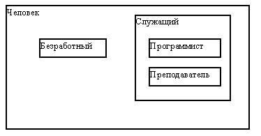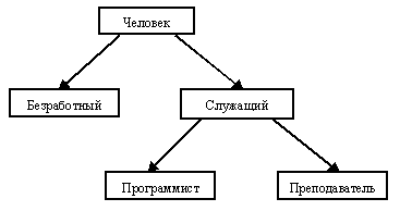 Рис. 1.5. С другой стороны, очевидно, что из соображений здравого смысла и безработные, и служащие обладают общими свойствами, характерными для типа "Человек", а программисты и преподаватели относятся к категории "Служащие". Эти соображения приводят нас к рисунку 1.6, на котором показана иерархия включения значений этих типов данных. Это означает, что, в частности, должна иметься возможность единообразной работы со значениями типа "Человек" независимо от того, сформировано ли соответствующее значение конструктором этого типа или же конструктором любого из его подтипов. Конечно, при этом можно использовать только те операции, которые специфицированы во внешнем представлении типа "Человек".
