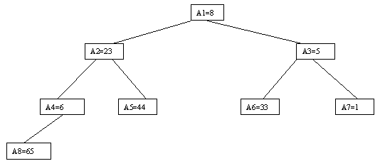 Рис. 2.9. Очевидно, что при построении пирамиды нас будут интересовать элементы a[n/2], a[n/2-1], ..., a[1] для массивов с четным числом элементов и элементы a[(n-1)/2], a[(n-1)/2-1], ..., a[1] для массивов с нечетным числом элементов (поскольку только для таких элементов существенны ограничения пирамиды). Пусть i - наибольший индекс из числа индексов элементов, для которых существенны ограничения пирамиды. Тогда берется элемент a[i] в построенном дереве и для него выполняется процедура просеивания, состоящая в том, что выбирается ветвь дерева, соответствующая min(a[2?i], a[2?i+1]), и значение a[i] меняется местами со значением соответствующего элемента. Если этот элемент не является листом дерева, для него выполняется аналогичная процедура и т.д. Такие действия выполняются последовательно для a[i], a[i-1], ..., a[1]. Легко видеть, что в результате мы получим древовидное представление пирамиды для исходного массива (последовательность шагов для используемого в наших примерах массива показана на рисунках 2.10-2.13).