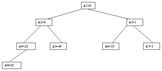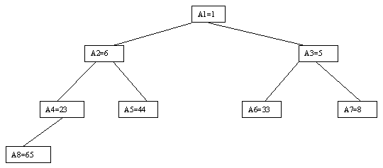 Рис. 2.8. Восьмой шаг На каждом из n шагов, требуемых для сортировки массива, нужно log n (двоичный) сравнений. Следовательно, всего потребуется n?log n сравнений, но для представления дерева понадобится 2n - 1 дополнительных единиц памяти. Имеется более совершенный алгоритм, который принято называть пирамидальной сортировкой (Heapsort). Его идея состоит в том, что вместо полного дерева сравнения исходный массив a[1], a[2], ..., a[n] преобразуется в пирамиду, обладающую тем свойством, что для каждого a[i] выполняются условия a[i] <= a[2i] и a[i] <= a[2i+1]. Затем пирамида используется для сортировки. Наиболее наглядно метод построения пирамиды выглядит при древовидном представлении массива, показанном на рисунке 2.9. Массив представляется в виде двоичного дерева, корень которого соответствует элементу массива a[1]. На втором ярусе находятся элементы a[2] и a[3]. На третьем - a[4], a[5], a[6], a[7] и т.д. Как видно, для массива с нечетным количеством элементов соответствующее дерево будет сбалансированным, а для массива с четным количеством элементов n элемент a[n] будет единственным (самым левым) листом "почти" сбалансированного дерева.
