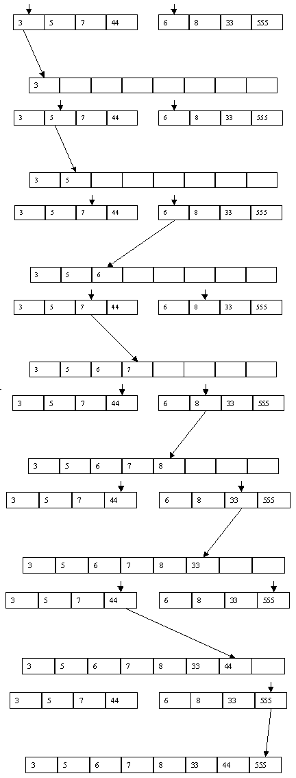 Сортировки со слиянием, как правило, применяются в тех случаях, когда требуется отсортировать последовательный файл, не помещающийся целиком в основной памяти. Методам внешней сортировки посвящается следующая часть книги, в которой основное внимание будет уделяться методам минимизации числа обменов с внешней памятью. Однако существуют и эффективные методы внутренней сортировки, основанные на разбиениях и слияниях. Один из популярных алгоритмов внутренней сортировки со слияниями основан на следующих идеях (для простоты будем считать, что число элементов в массиве, как и в нашем примере, является степенью числа 2). Сначала поясним, что такое слияние. Пусть имеются два отсортированных в порядке возрастания массива p[1], p[2], ..., p[n] и q[1], q[2], ..., q[n] и имеется пустой массив r[1], r[2], ..., r[2?n], который мы хотим заполнить значениями массивов p и q в порядке возрастания. Для слияния выполняются следующие действия: сравниваются p[1] и q[1], и меньшее из значений записывается в r[1]. Предположим, что это значение p[1]. Тогда p[2] сравнивается с q[1] и меньшее из значений заносится в r[2]. Предположим, что это значение q[1]. Тогда на следующем шаге сравниваются значения p[2] и q[2] и т.д., пока мы не достигнем границ одного из массивов. Тогда остаток другого массива просто дописывается в "хвост" массива r. Пример слияния двух массивов показан на рисунке 2.14.