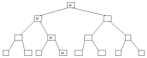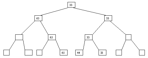 Начнем с простого метода сортировки с помощью дерева, при использовании которого явно строится двоичное дерево сравнения ключей. Построение дерева начинается с листьев, которые содержат все элементы массива. Из каждой соседней пары выбирается наименьший элемент, и эти элементы образуют следующий (ближе к корню уровень дерева). Из каждой соседней пары выбирается наименьший элемент и т.д., пока не будет построен корень, содержащий наименьший элемент массива. Двоичное дерево сравнения для массива, используемого в наших примерах, показано на рисунке 2.1. Итак, мы уже имеем наименьшее значение элементов массива. Для того, чтобы получить следующий по величине элемент, спустимся от корня по пути, ведущему к листу с наименьшим значением. В этой листовой вершине проставляется фиктивный ключ с "бесконечно большим" значением, а во все промежуточные узлы, занимавшиеся наименьшим элементом, заносится наименьшее значение из узлов - непосредственных потомков (рис. 2.2). Процесс продолжается до тех пор, пока все узлы дерева не будут заполнены фиктивными ключами (рисунки 2.3 - 2.8).