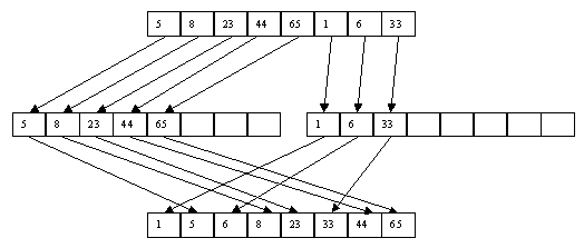 Рис. 2.14. Для сортировки со слиянием массива a[1], a[2], ..., a[n] заводится парный массив b[1], b[2], ..., b[n]. На первом шаге производится слияние a[1] и a[n] с размещением результата в b[1], b[2], слияние a[2] и a[n-1] с размещением результата в b[3], b[4], ..., слияние a[n/2] и a[n/2+1] с помещением результата в b[n-1], b[n]. На втором шаге производится слияние пар b[1], b[2] и b[n-1], b[n] с помещением результата в a[1], a[2], a[3], a[4], слияние пар b[3], b[4] и b[n-3], b[n-2] с помещением результата в a[5], a[6], a[7], a[8], ..., слияние пар b[n/2-1], b[n/2] и b[n/2+1], b[n/2+2] с помещением результата в a[n-3], a[n-2], a[n-1], a[n]. И т.д. На последнем шаге, например (в зависимости от значения n), производится слияние последовательностей элементов массива длиной n/2 a[1], a[2], ..., a[n/2] и a[n/2+1], a[n/2+2], ..., a[n] с помещением результата в b[1], b[2], ..., b[n]. Для случая массива, используемого в наших примерах, последовательность шагов показана в таблице 2.9. Таблица 2.9. Пример сортировки со слиянием
