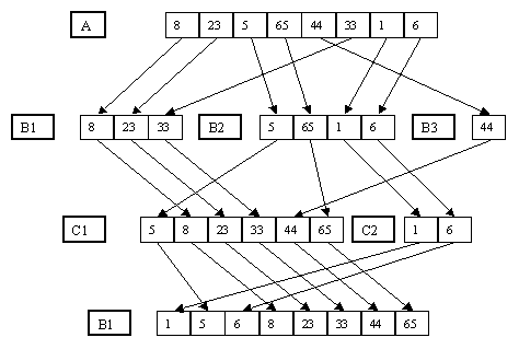 В основе метода внешней сортировки сбалансированным многопутевым слиянием является распределение серий исходного файла по m вспомогательным файлам B1, B2, ..., Bm и их слияние в m вспомогательных файлов C1, C2, ..., Cm. На следующем шаге производится слияние файлов C1, C2, ..., Cm в файлы B1, B2, ..., Bm и т.д., пока в B1 или C1 не образуется одна серия. Многопутевое слияние является естественным развитием идеи обычного (двухпутевого) слияния, иллюстрируемого рисунком 2.14. Пример трехпутевого слияния показан на рисунке 3.3.