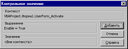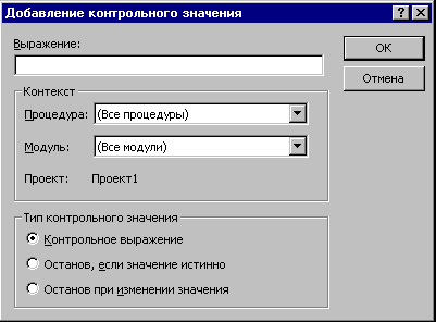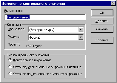Используется для удаления или изменения содержания или типа контрольного выражени. Важно. При выборе контекста контрольного выражения всегда следует использовать самую узкую область определения, удовлетворяющую поставленной задаче. Выбор всех процедур или всех модулей может значительно замедлить выполнение, поскольку контрольное выражение вычисляется после выполнения каждой инструкции. Выбор в качестве контекста отдельной процедуры влияет на выполнение только в те моменты, когда эта процедура находится в списке активных вызовов. Параметры окна диалога Выражение По умолчанию отображает выделенное в окне модуля выражение. Выражение может быть переменной, свойством, вызовом функции или другим допустимым выражением. Возможно его изменение. Контекст Задает область определения переменных в контрольном выражении. Процедура - Отображает имя процедуры, в которой определено выделенное выражение (по умолчанию). Задает процедуру(ы), в которых вычисляется контрольное выражение. Допускается выбор всех процедур либо отдельной процедуры. Модуль - Отображает имя модуля, в котором определено выделенное выражение (по умолчанию). Допускается выбор всех модулей либо отдельного модуля для вычисления значения контрольного выражения. Проект - Отображает имя текущего проекта. Вычисление выражений вне текущего проекта невозможно. Тип контрольного значения Определяет реакцию Visual Basic на контрольное выражение. Контрольное выражение - Отображает в области Контрольные окна отладки выражение и его значение. При входе в режим прерывания значение этого выражения автоматически обновляется. Останов, если значение истинно - Выполнение программы автоматически прерывается, когда значение выражения становится истинным или ненулевым (недопустимо для строковых выражений). Останов при изменении значения - Выполнение программы автоматически прерывается при изменении значения выражения в указанном контексте. Удалить Удаляет контрольное выражение. Окно диалога Контрольное значение