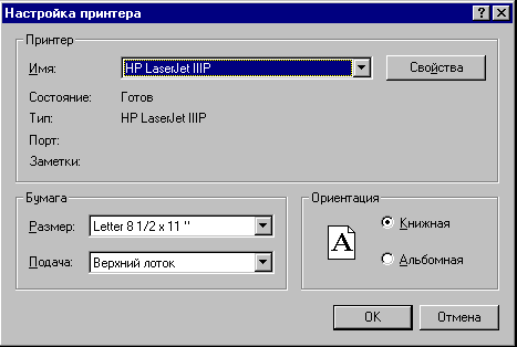 Отображается при нажатии кнопки Настройка в окне диалога Печать. Используется для выбора принтера, ориентации и размера страницы. Параметры окна диалога Принтер Позволяет задать принтер. Если принтер не выбран, печать будет осуществлена на принтере Windows по умолчанию. Имя - Отображает список доступных принтеров. Состояние - Отображает состояние принтера и его готовность к работе. Тип - Отображает тип принтера. Место - Отображает место размещения принтера. Ели принтер сетевой, выводит путь к серверу. Заметки - Отображает физическое место размещения принтера, а также дополнительные сведения. Свойства - Отображает окно диалога Свойства для выбранного принтера, где задаются дополнительные параметры, такие как используемая бумага и способ печати графики. Бумага Позволяет выбрать размер и тип подачи бумаги (из доступных вариантов). Размеры и типы подачи бумаги зависят от выбранного принтера и изменяются при изменении принтера. Размер бумаги - Отображает список доступных размеров бумаги. Подача бумаги - Отображает доступные типы подачи бумаги для выбранного принтера. Ориентация Позволяет выбрать книжную или альбомную ориентацию листа при печати.