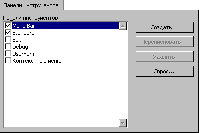 Позволяет создавать, переименовывать, удалять или сбрасывать панели инструментов. Параметры вкладки Список Панели инструментов Отображает список встроенных в Visual Basic панелей инструментов, а также созданных пользователем. Если панель инструментов отображена, рядом с ней появляется отметка. Примечание. Строку меню скрыть невозможно. Ее можно только сбросить. Создать Отображает окно диалога Создание панели инструментов для ввода в поле Панель инструментов имени новой панели инструментов. Переименовать Отображает окно диалога Переименование панели для ввода нового имени панели инструментов. Команда доступна только для панелей, определенных пользователем. Удалить Удаляет определенную пользователем панель управления из текущего проекта. Команда доступна только для панелей, определенных пользователем. Сброс Отменяет любые изменения, внесенные во встроенные панели инструментов и восстанавливает их первоначальное состояние. Команда доступна только для встроенных панелей. Вкладка Команды (окно диалога Настройка)