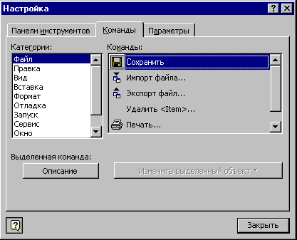 Позволяет добавлять или изменять элементы управления в строке меню или панели инструментов. Допускается также изменение изображения кнопок и текста добавленных пользователем команд. Параметры вкладки Категории Отображает список различных категорий команд. Команды Отображает список элементов управления, доступных для категории, выбранной в списке категорий. Допускается перетаскивание команды с помощью мыши в нужную панель инструментов. Для добавления команды в меню следует перетащить ее на соответствующий заголовок меню, а затем в нужное место раскрывшегося меню. Описание Отображает краткую справку для выделенного элемента управления. Изменить выделенный объект Позволяет изменить выделенную команду. Сброс - Восстанавливает состояние команды по умолчанию. Удалить - Удаляет команду. Имя - Изменяет имя элемента управления. Клавиша быстрого вызова задается с помощью символа амперсант (&). Копировать значок на кнопке - Копирует изображение кнопки в буфер обмена. Вставить значок на кнопке - Вставляет изображение кнопки из буфера обмена. Восстановить значок на кнопке - Восстанавливает заданное по умолчанию изображение кнопки. Изменить значок на кнопке - Отображает окно диалога Редактор кнопок. Выбрать значок для кнопки - Отображает список значков, из которого следует выбрать новое изображение кнопки. Основной стиль - Для кнопок панели инструментов отображать только значок, для команд меню - значок и имя. Только текст (всегда) - Отображать только имя команды. Только текст (в меню) - Скрывает значок (если есть) для команды меню. Для кнопок панели инструментов не работает. Значок и текст - Отображает значок и имя для панелей инструментов. Для команд меню не работает.