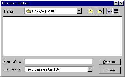 Служит для поиска и вставки файла в модуль проекта. Параметры окна диалога Папка Отображает список доступных компьютеров, серверов, дисков и папок, используемых для поиска открываемого проекта. Переход на один уровень вверх Отображает список папок или дисков, находящихся на один уровень выше текущей папки. Создать новую папку Создает новую папку. Мелкие значки Отображает папки и документы в виде списка маленьких значков и имен. Сведения Отображает папки и документы в виде списка, включающего значок, имя, размер (только для документов), тип, дату и время последнего изменения. Имя файла Служит для ввода или выбора имени вставляемого файла. Тип файлов Служит для выбора типа файла; по умолчанию задаются текстовые файлы (*.txt). Файлы выбранного типа появляются в списке имен файлов. Открыть Вставка выбранного файла. Отмена Закрытие окна диалога без вставки файла.