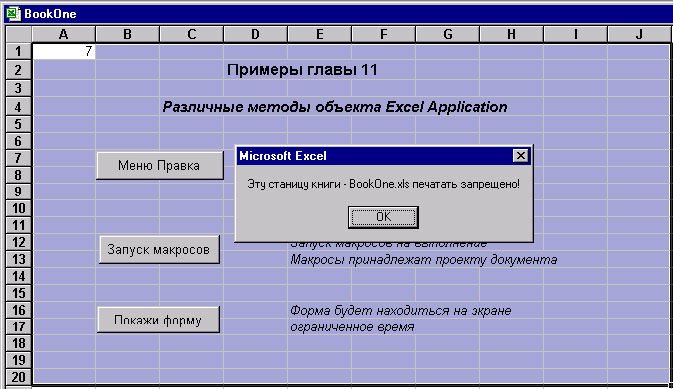 Специальный обработчик события объекта Workbook книги BookOne запрещает печать только этой книги, а общий для всех книг обработчик того же события, но находящийся в объекте Application, запрещает печать только первого листа, но для всех рабочих книг. Вот как выглядит сообщение, выданное для книги BookOne общим обработчиком при попытке распечатать содержимое первого листа книги: