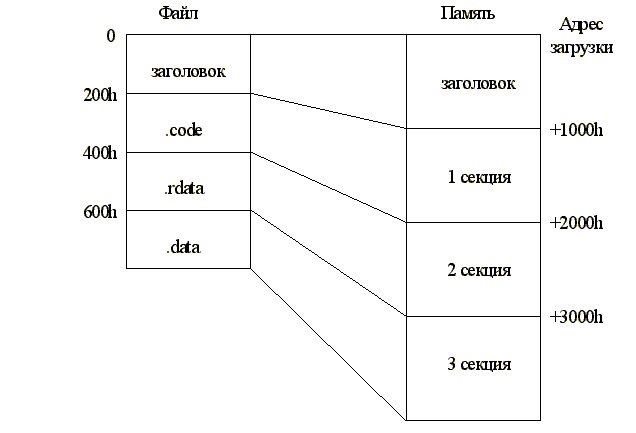Таблица секций имеет столько входов, сколько секций в образе программы. Расположение секций в файле и в виртуальной памяти созданного процесса может не совпадать. Данные различных секций как в файле, так и в памяти располагаются не вплотную друг к другу - они должны быть соответствующим образом выровнены. Например, если код занимает всего 2 байта, следующая за ним секция (допустим, данных) располагается не по смещению +2 байта, а на границе следующей страницы, т.е. как минимум через 4 Кб, если это образ в памяти, и минимум через 512 байт для образа в файле. Значения для выравнивания в файле и в памяти указаны в PE-заголовке, причем они обязательны. Секция может содержать т.н. неинициализированные данные. Фактически, это просто резервирование определенных адресов памяти под будущие переменные. Для таких данных место в файле не отводится; память резервируется лишь при загрузке на исполнение. Если вся секция содержит лишь неинициализированные данные, поля размера данных секции в файле и смещения начала данных секции в файле равны нулю. В любом случае, когда размер секции в файле меньше указанного размера секции в памяти, остаток заполняется до нужного размера нулями. Поле флагов секции - то самое, где задаются атрибуты страниц памяти, отводимых под секцию. Возможно использование до 32 флагов (по одному на каждый бит 4-байтного значения), но часть из них зарезервирована, другая часть используется лишь в объектных файлах. Биты нумеруются от младшего к старшему, начиная от 0 (самый младший бит - 0, самый старший - 31). Наиболее употребительные для исполняемых файлов следующие: бит 5 - секция кода; Например, в секции кода с разрешениями на чтение и исполнение установлены следующие флаги: 01100000 00000000 00000000 00100000 (60 00 00 20 h) Секция с инициализированными данными с разрешениями на чтение и запись: 11000000 00000000 00000000 01000000 (C0 00 00 40 h) Та же секция, но с разрешением только для чтения: 01000000 00000000 00000000 01000000 (40 00 00 40 h) Перейдем, наконец, к практике и составим шаблон заголовка PE-файла, имеющего 3 секции с минимальными размерами. Тогда в памяти каждая будет занимать 1000h (1 страница - отвести меньше памяти невозможно), а в файле - 200h байт (1 сектор диска). Такими же будут и значения выравнивания. Первой пусть идет секция кода; назовем ее '.code' (см. рис.) Она будет располагаться по смещению 200h от начала файла, а в памяти - по смещению 1000h от адреса загрузки (первую страницу памяти и первые 200h байтов файла занимает заголовок). Секция кода будет иметь флаги, которые мы вычислили ранее (60000020h) Следующей будет секция с данными только для чтения; назовем ее '.rdata'. Она будет расположена в файле по смещению 400h, а в памяти - по смещению 2000h. Флаги: 40000040h. За ней - секция данных с разрешениями на чтение и запись: '.data', расположение в файле - 600h, в памяти - 3000h; флаги: C0000040h. Теперь составим командный файл для отладчика debug. Имеет смысл сначала создать специальную папку "Шаблоны". В ней сохраним этот файл для использования в дальнейшем. Открываем Блокнот и набираем: n Header.bin r cx 200 f 0 l 200 0 e 0 'MZ' e 3C 40 e 40 'PE' e 44 4C 01 Бинарный файл с заголовом будет называться 'Header.bin', его размер - 200h байт. Сначала очищаем "область сборки" - первые 200h байт, затем набираем стандартные сигнатуры. Программы-заглушки у нас не будет - PE-заголовок следует непосредственно за DOS-заголовком; заодно это сэкономит размер заголовка. А вот дальше пойдут поля PE-заголо
