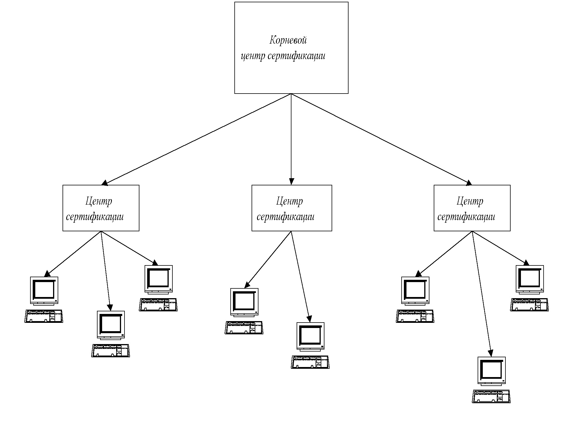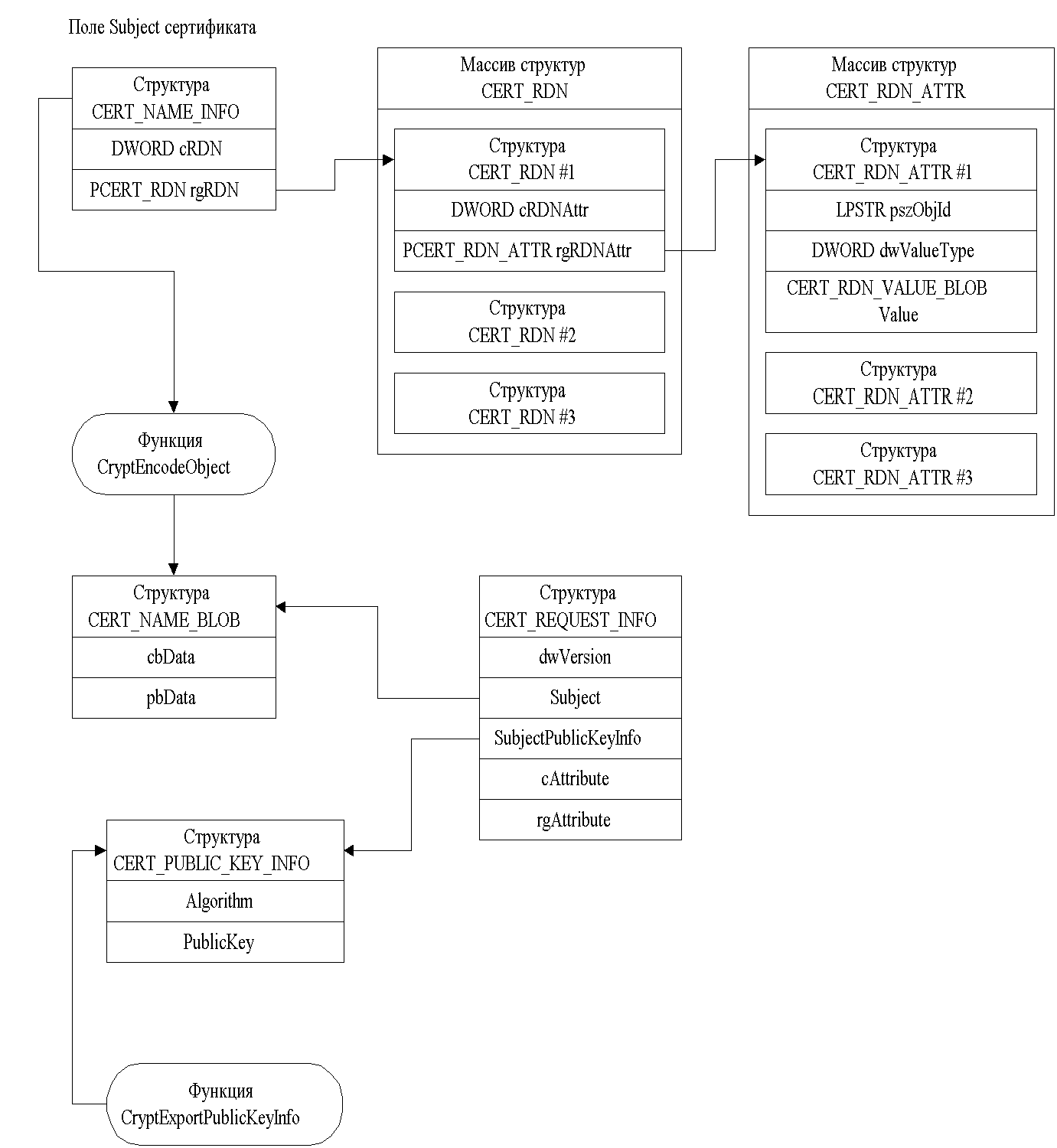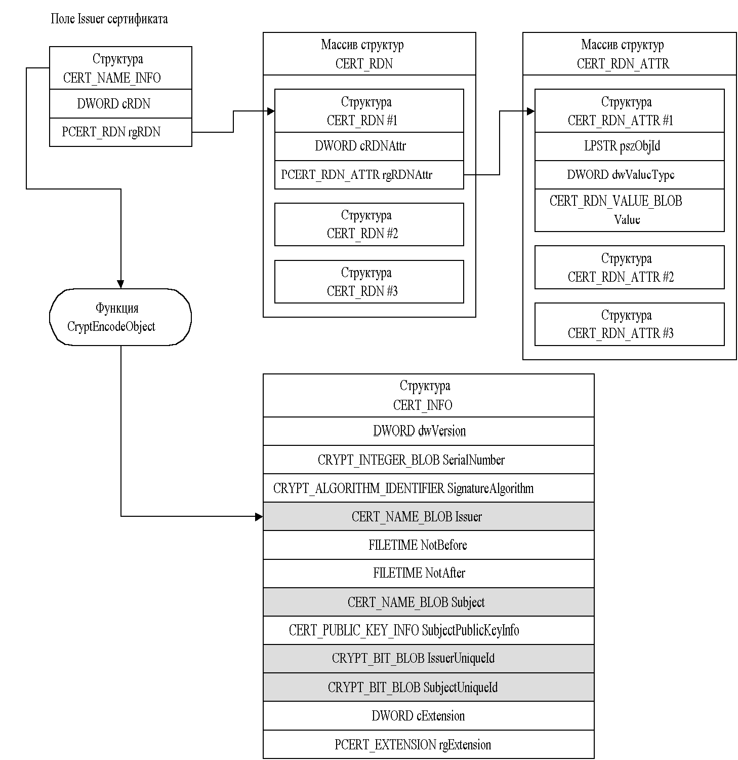 Итак, ЦС удостоверяет личность Алисы и своей подписью заверяет связь между ней и ее ключом. Поскольку сведения об Алисе подписаны, Боб может убедиться в их целостности. Для этого ему нужно обратиться в ЦС и проверить цифровую подпись, входящую в состав сертификата. Даже если Ева, о который мы упомянули вначале, перехватит сертификат и изменит сведения об Алисе, то ей придется подделывать подпись ЦС. Кроме того, Боб тоже может получить в ЦС "электронное удостоверение личности" - и тогда уверенностью в подлинности открытых ключей будут обладать оба корреспондента. Остался один невыясненный вопрос: на чем держится доверие к Центру сертификации? Если Алиса и Боб - сотрудники одной и той же организации, а переписку ведут в деловых целях, то в качестве ЦС может выступить сама организация. Для этого ей потребуется обзавестись штатным специалистом по защите информации и поручить ему выполнение всех процедур, связанных с выдачей и проверкой сертификатов. Ну а на чем должно основываться доверие фирмы к своему сотруднику, думаем, объяснять не нужно. В случае же, если Алиса и Боб - представители различных организаций, им придется обращаться в независимый центр сертификации. Деятельность таких центров, как правило, лицензируется службами безопасности страны или другими государственными органами. Например, украинские организации, работающие в сфере защиты информации, должны получить лицензию СБУ. Сертификату, выданному таким ЦС, можно доверять в той же степени, в какой вы доверяете паспорту гражданина некого государства. Центры сертификации могут находиться в различных странах, работать с различным программным обеспечением, поддерживать разные стандарты сертификатов и отличающиеся процедуры их выдачи. Поэтому возникает необходимость наладить отношения доверия между самими ЦС. Эта система доверительных отношений может строиться по иерархическому принципу. Существует небольшое число ЦС, называющихся корневыми (Root Certification Authority). Они удостоверяют сертификаты дочерних центров, которые, в свою очередь, подтверждают подлинность других ЦС и т.д. В глобальном масштабе структура ЦС представляет собой несколько иерархий (см. рис. 1). Поддержка сертификатов в CryptoAPI Рассмотрим решение основных задач, возникающих при выпуске и обслуживании сертификатов на уровне библиотеки ОС Windows - CryptoAPI. Кстати говоря, для "внутреннего" употребления сертификатов (в рамках одной организации) процедуру лицензирования проходить не нужно. Никто ведь не может запретить вам обмениваться файлами, которые по секрету от СБУ вы будете считать цифровыми документами. Чтобы обзавестись собственным сертификатом, прежде всего нужно создать запрос специального формата, который должен содержать ваше имя, открытые ключи обмена ключами и подписи. Этот запрос подписывается отправителем при помощи личного закрытого ключа и отсылается в центр сертификации. Запрос на получение сертификата Рассмотрим процесс создания запроса более подробно. Для хранения данных запроса в CryptoAPI предназначена специальная структура - CERT_REQUEST_INFO. Она содержит ссылки на другие структуры, хранящие имя владельца сертификата, информацию об открытых ключах и, возможно, некоторые дополнительные атрибуты (рис. 2). В результате для создания запроса сертификата следует выполнить следующие шаги: